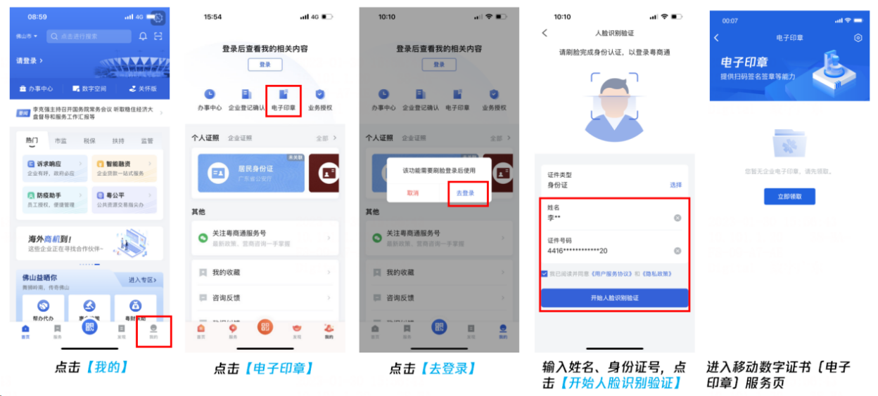 1.經辦人須刷臉登錄粵商通APP,在【我的】-【電子印章】中將數字證書安裝好,并生成包括個人章在內的三個印章;