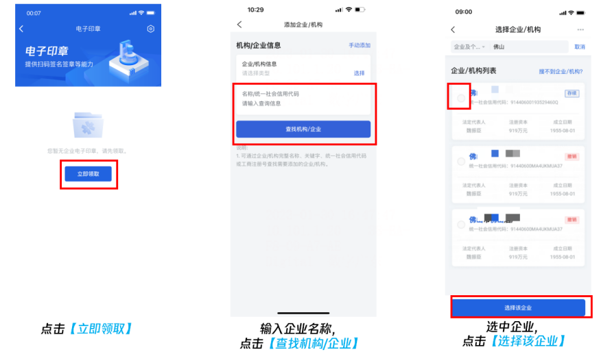 搜索并選擇需領取移動數字證書(電子印章)的企業。