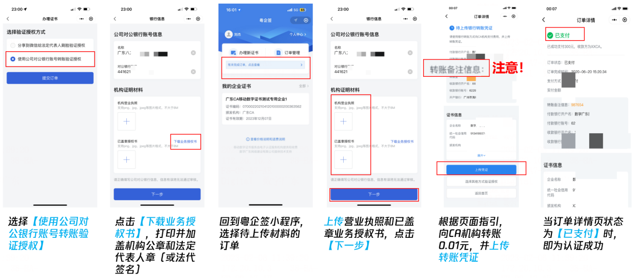 下載業務授權書須加蓋機構公章、法定代表人章(或由法代簽名)及填寫申請日期,在系統內上傳營業執照和已蓋章的業務授權書。使用對公銀行賬號向CA機構轉賬0.01元并上傳轉賬憑證,CA機構審核通過后即可完成驗證。*注意:向CA機構轉賬時,務必將系統內“轉賬備注信息”中的信息作為轉賬備注。