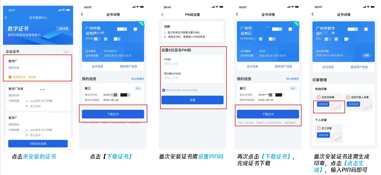 2.在粵商通APP安裝數字證書,設置PIN碼時,6位數字需謹記,如果忘記,可在粵商通APP-我的-電子印章-功能設置-PIN碼設置處重置;