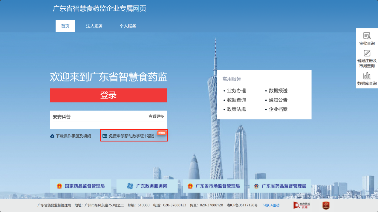 輸入登錄地址訪問企業專屬網頁,點擊登錄按鈕右下方“免費申領移動數字證書指引”跳轉至廣東省藥品監督管理局官網查看操作指引,并下載安裝移動數字證書。
