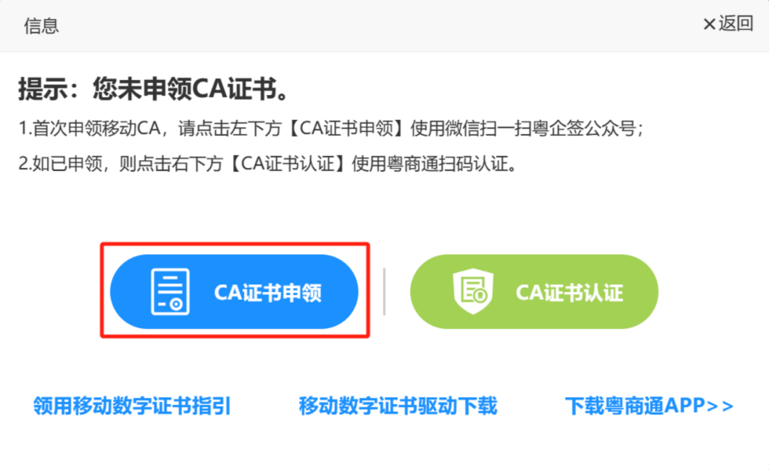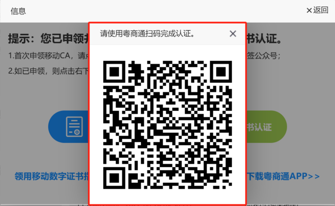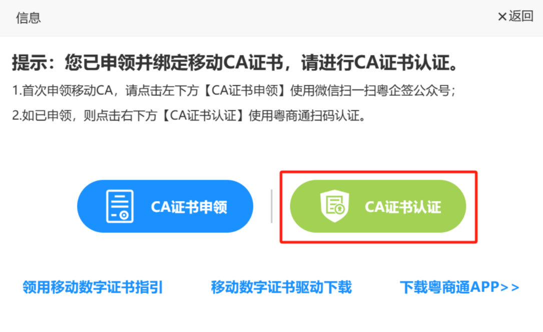 如已申領,則點擊右下方【CA證書認證】使用粵商通掃碼認證。