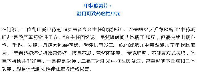 非法添加:左甲狀腺素鈉片。該藥物屬于處方藥,用于治療甲狀腺功能減退(甲減)及相關(guān)疾病。