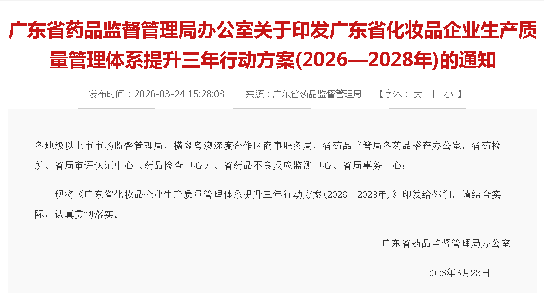 《廣東省化妝品企業生產質量管理體系提升三年行動方案(2026—2028年)》