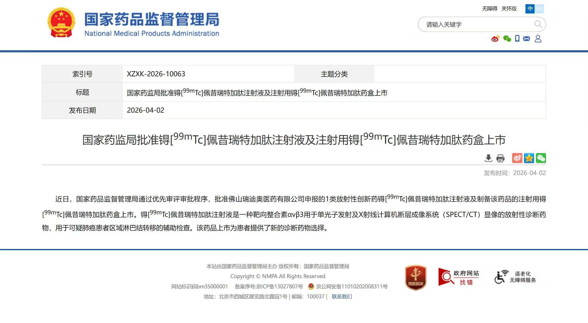 近日,國家藥監局批準廣東佛山瑞迪奧醫藥有限公司申報的锝 [ 99mTc ] 佩昔瑞特加肽注射液及制備該藥品的注射用锝[ 99m Tc ] 佩昔瑞特加肽藥盒上市,用于可疑肺癌患者區域淋巴結轉移的輔助檢查。