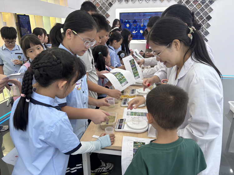 小記者們興致勃勃地來到了中藥數字化標本館及智慧苗圃。他們在巨大的中藥材標本墻前停住了腳步,一罐罐中草藥標本栩栩如生,千年百草與現代科技交融輝映,仿佛在講述中醫藥文化從涓涓細流到江河匯流的發展歷程。工作人員耐心講解了廣陳皮、化橘紅、廣藿香等嶺南道地藥材的“前世今生”,帶領孩子們開啟了一場跨越時空的中醫藥文化之旅。