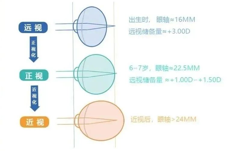 由于幼兒眼球尚未完全發(fā)育,眼軸(前后軸)相對(duì)較短,這是一種天然遠(yuǎn)視狀態(tài)。隨著年齡增長(zhǎng),眼軸逐漸變長(zhǎng),遠(yuǎn)視儲(chǔ)備不斷消耗,在12歲左右眼球發(fā)育成為一個(gè)正球形,光線進(jìn)入眼睛后會(huì)剛好聚焦在視網(wǎng)膜上,此時(shí)既沒(méi)有遠(yuǎn)視也沒(méi)有近視,視力最為清晰。