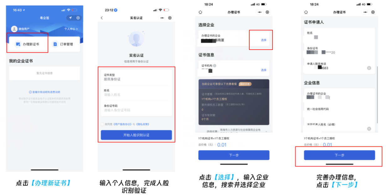 在粵企簽小程序辦理證書(印章),辦理人可通過“法定代表人人臉識別驗證”或“對公銀行賬號轉賬驗證”完成企業認證。