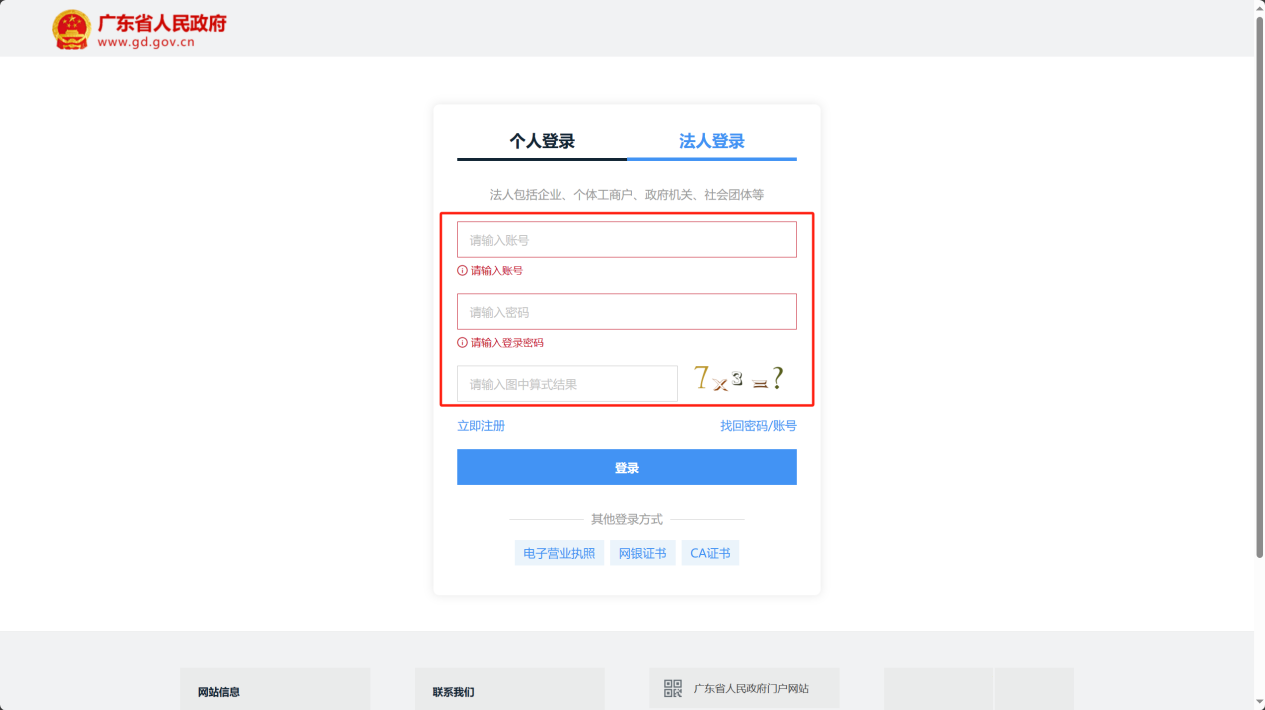 2、通過省統一的法人賬號密碼方式登錄系統。(如果還沒有賬號密碼請先點擊【立即注冊】,按照系統提示進行賬號注冊)
