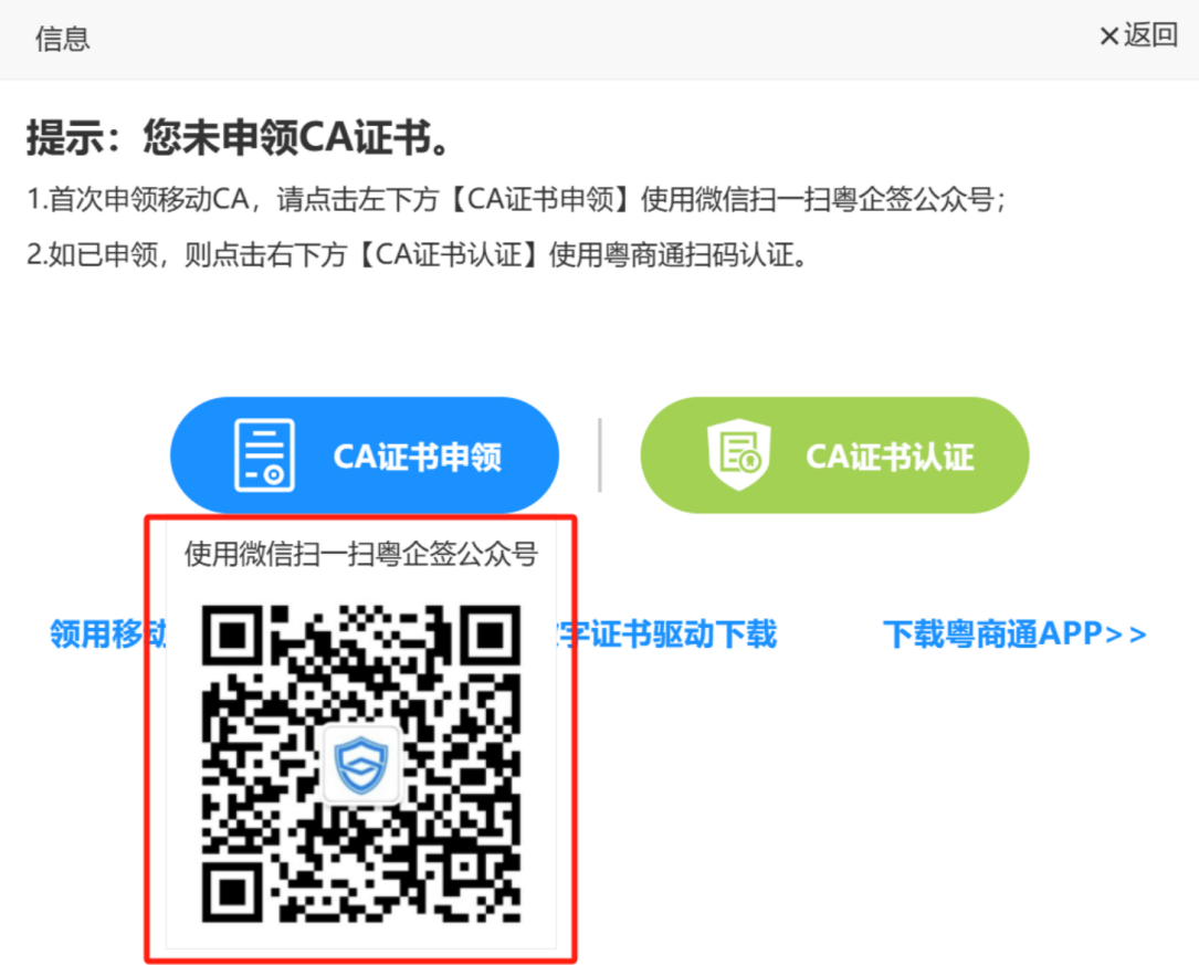 如已申領,則點擊右下方【CA證書認證】使用粵商通掃碼認證。